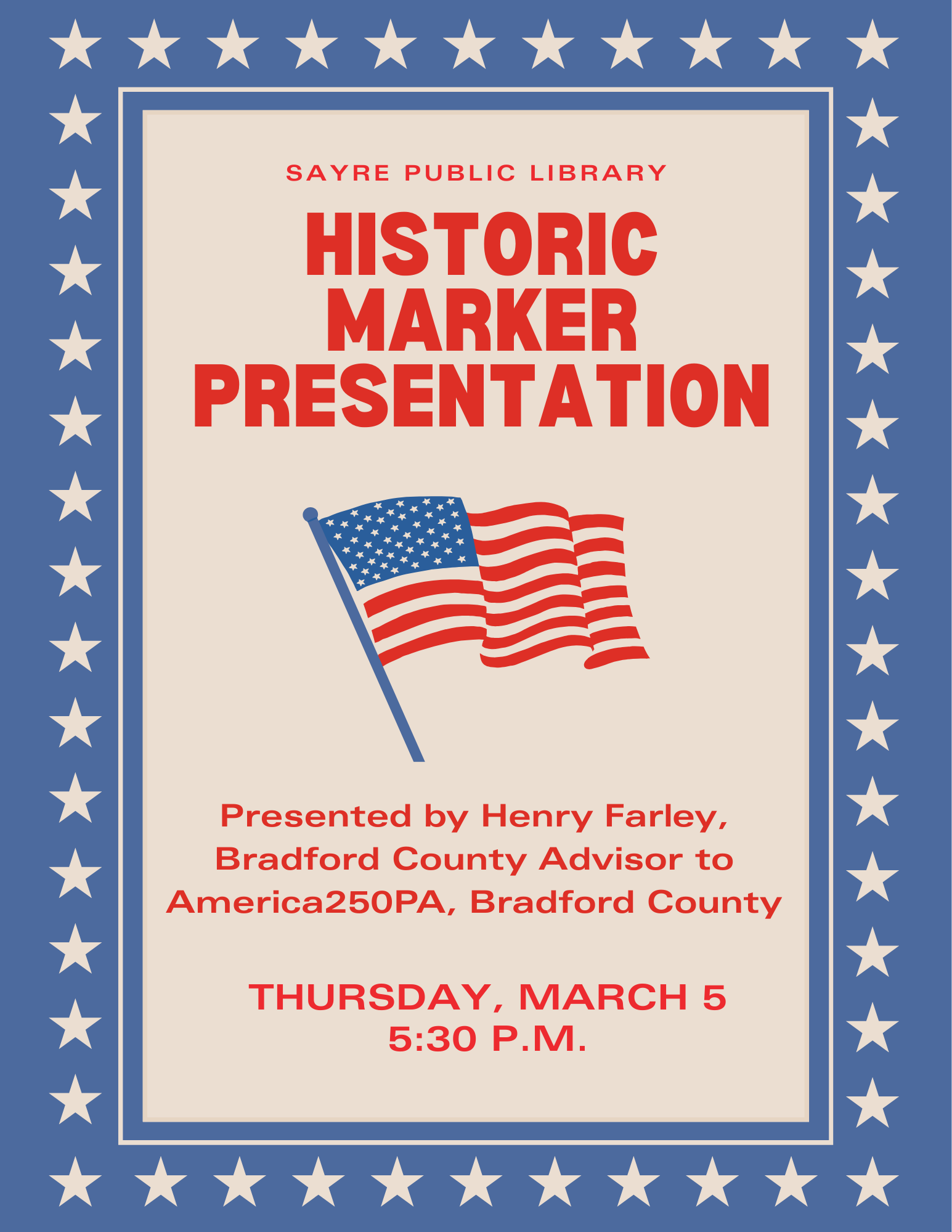 On Thursday, March 5, 2026, at 5:30 p.m. the Sayre Public Library will host a special presentation by Henry Farley, Bradford County Advisor to America250PA Bradford County. Farley will deliver a slide show that highlights the historic markers located throughout Bradford