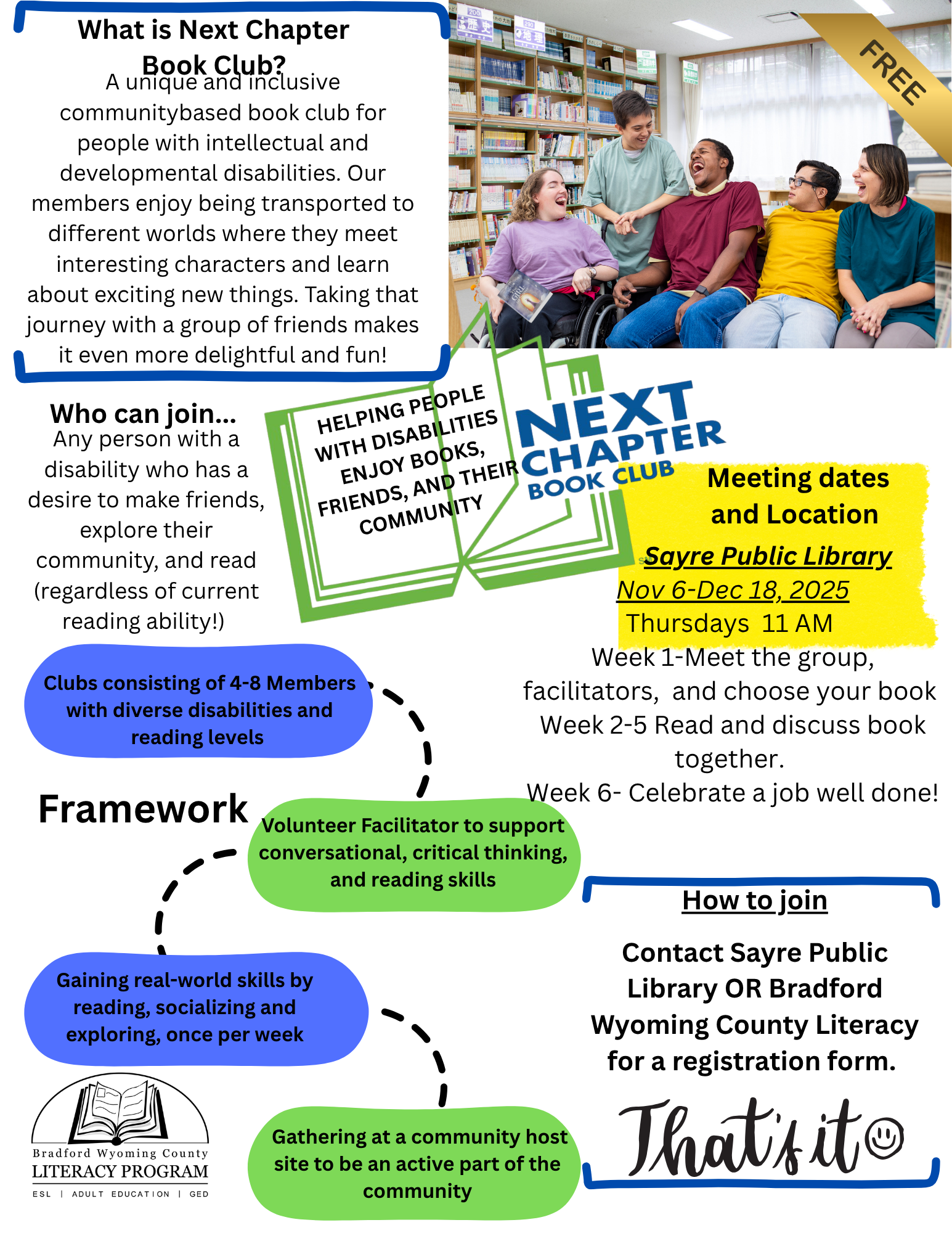 We are excited to announce our new book club for adults with developmental disabilities in partnership with the Bradford Wyoming County Literacy Program! Join us each Thursday morning at 11:00 […]